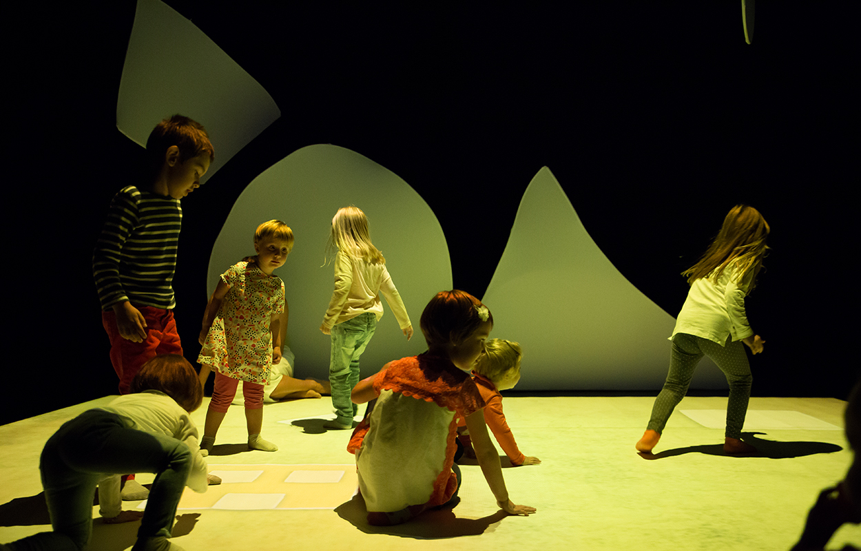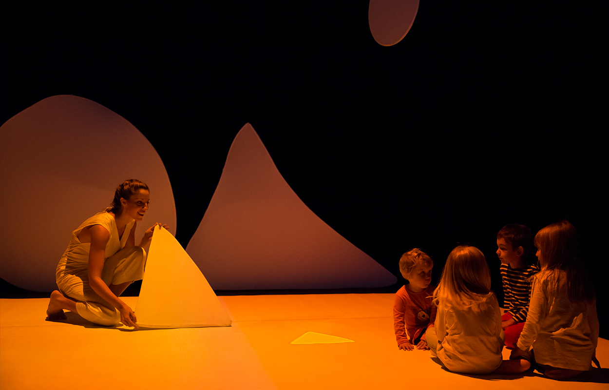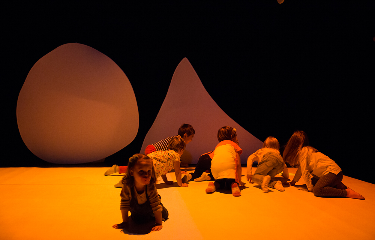 Dall’accordo dei due nasce la voglia di giocare e la scena si apre all’intervento del pubblico diventando così il luogo dove i bambini possono sperimentare/sperimentarsi: esplorare lo spazio, le forme, i suoni, i colori messi in gioco per loro e intorno a loro. Forme, suoni, colori che reagiscono e si animano a seguito dei loro movimenti, delle loro azioni per comporre infine un grande disegno.